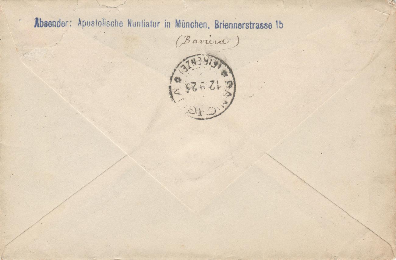 Schreiben der Apostolischen Nuntiatur in München an die Principessa Isabella Ruffo di Calabria in Mugello. Nuntius war von 1917-1925 Eugenio Pacelli, der spätere Papst Pius XII.