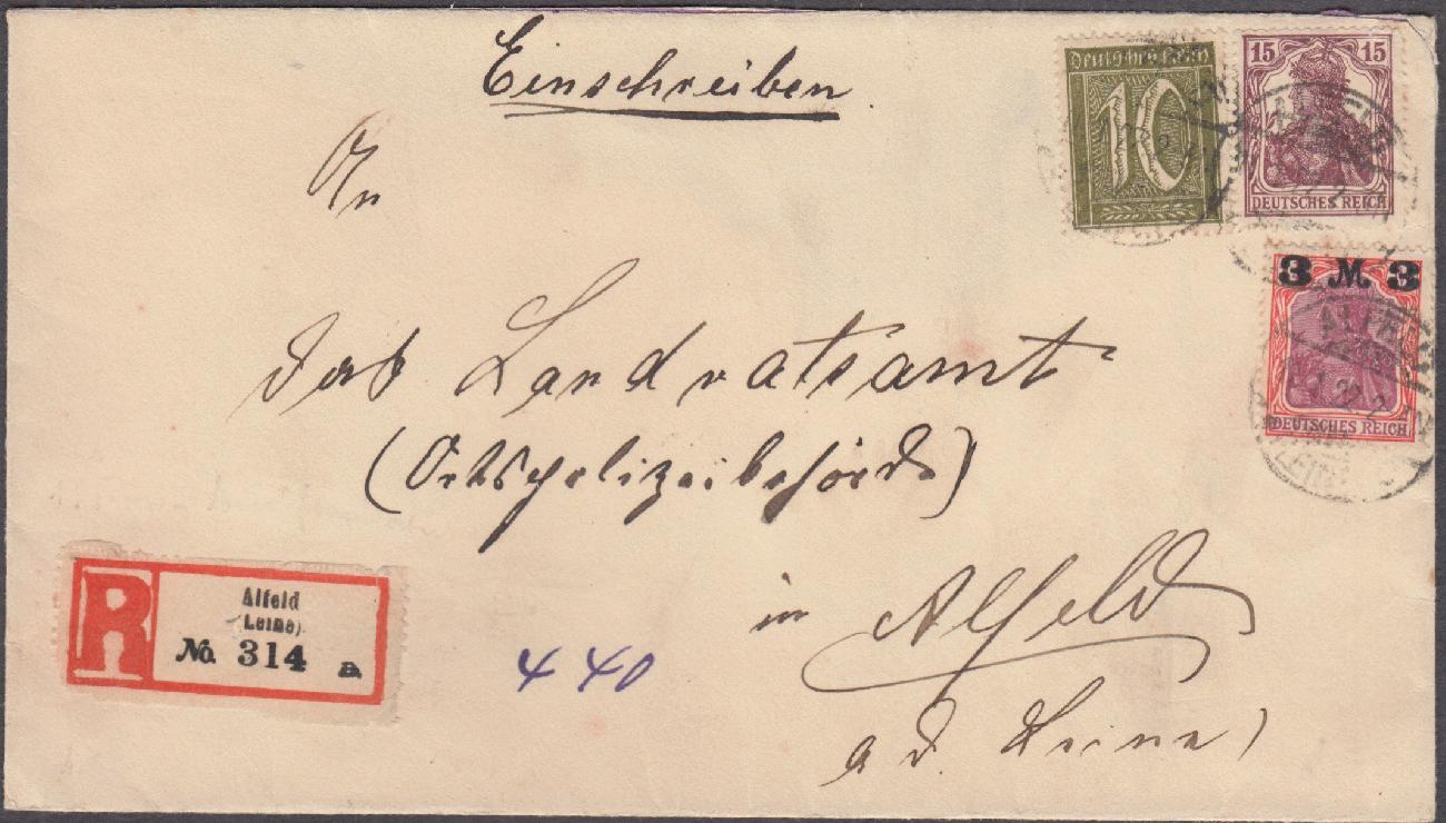 Beschreibung: Orts-Einschreibbrief mit Mi-Nr. 142 a, 155 I a und 159 a, ohne Ankunftsstempel
