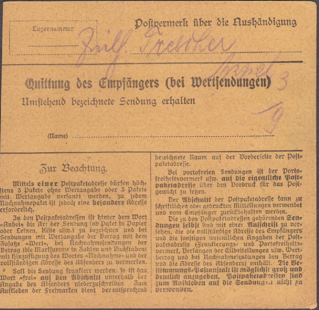 Beschreibung: Paketkarte mit EF Mi-Nr. 134 I, die Entfernung beträgt allerdings knapp 85 km- also falsch frankiert